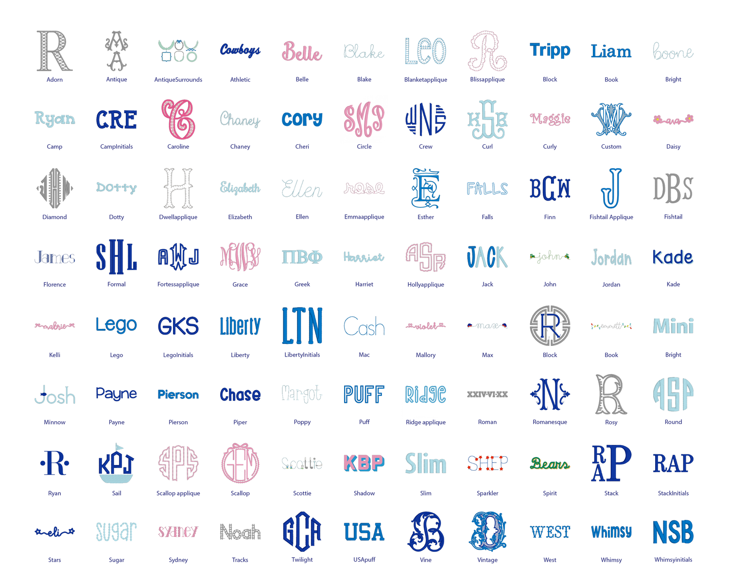 Typically, three letter monograms for girls read kPg (Katie Grace Pate). For boys they can be read rSj (Robert Jackson Smith) or RJS depending on font style chosen.