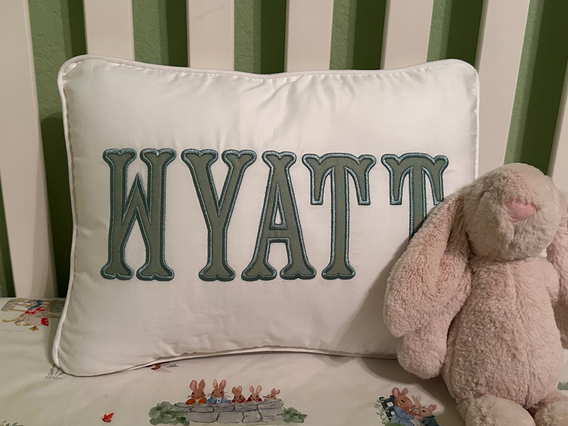 Add a touch of elegance to any room with our decorative throw pillows featuring scalloped or piped trim and stunning embroidery or applique. These pillows are the perfect finishing touch to any nursery, dorm room, or space needing a customized accessory. Customize these with a name, initial, or monogram in fabric that matches the trim or a different fabric for a pop of fun.