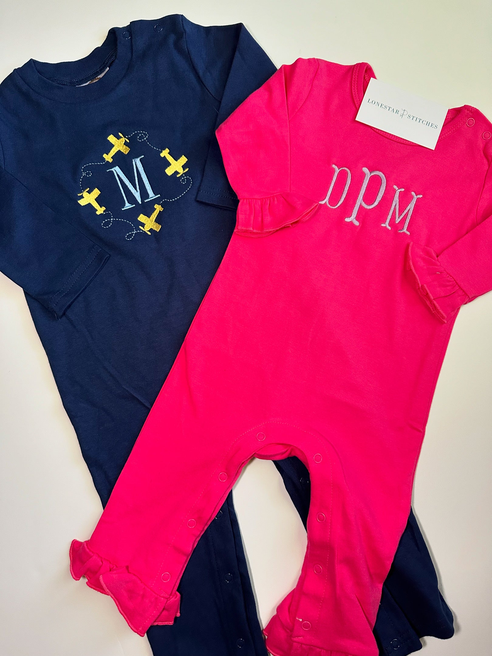 Enhance your little one's wardrobe with our ruffled long sleeve long pants romper, featuring charming embroidery or applique. This cozy and stylish romper, shown here with adorable team spirit embroidery, is made from high-quality materials to ensure your child's comfort and has snaps for easy changes. Perfect for playtime or special occasions, the romper's personalized embroidery or applique adds a unique touch that makes it stand out. Whether as a thoughtful gift or a special addition to your child's collection, our embroidered and appliqued rompers offer a delightful blend of elegance and fun. Embrace personalized style and premium craftsmanship with our ruffled long sleeve long pants romper.
