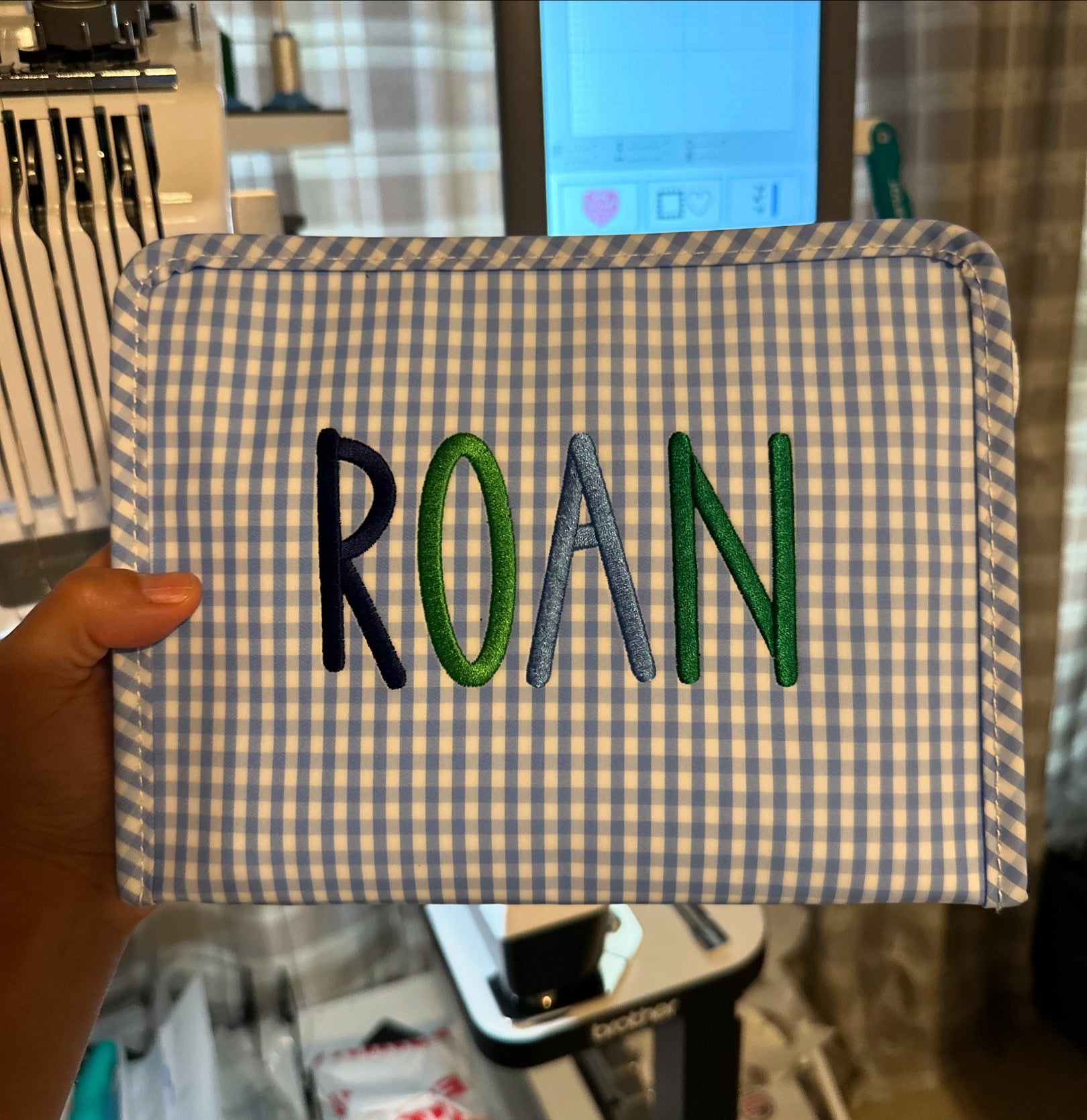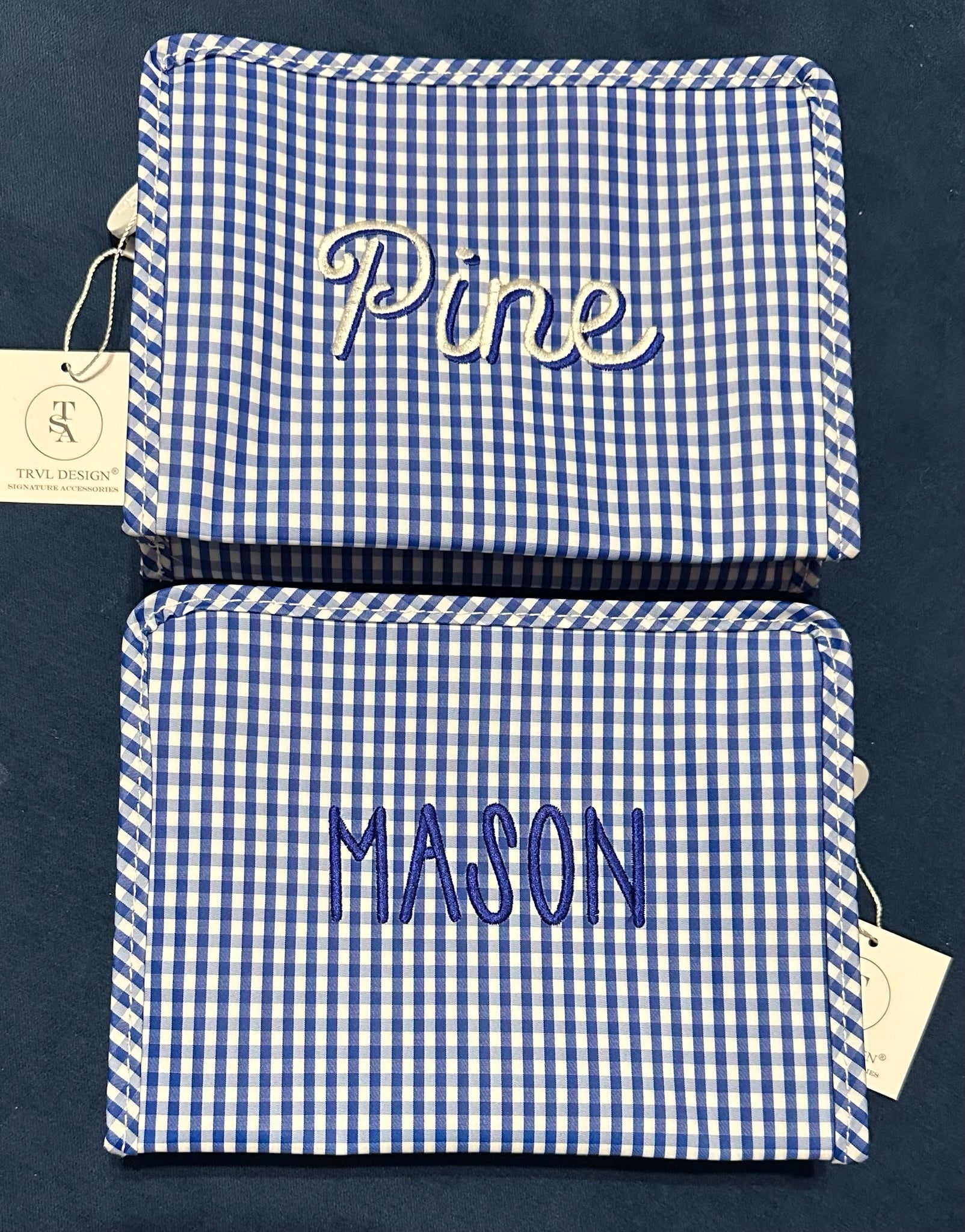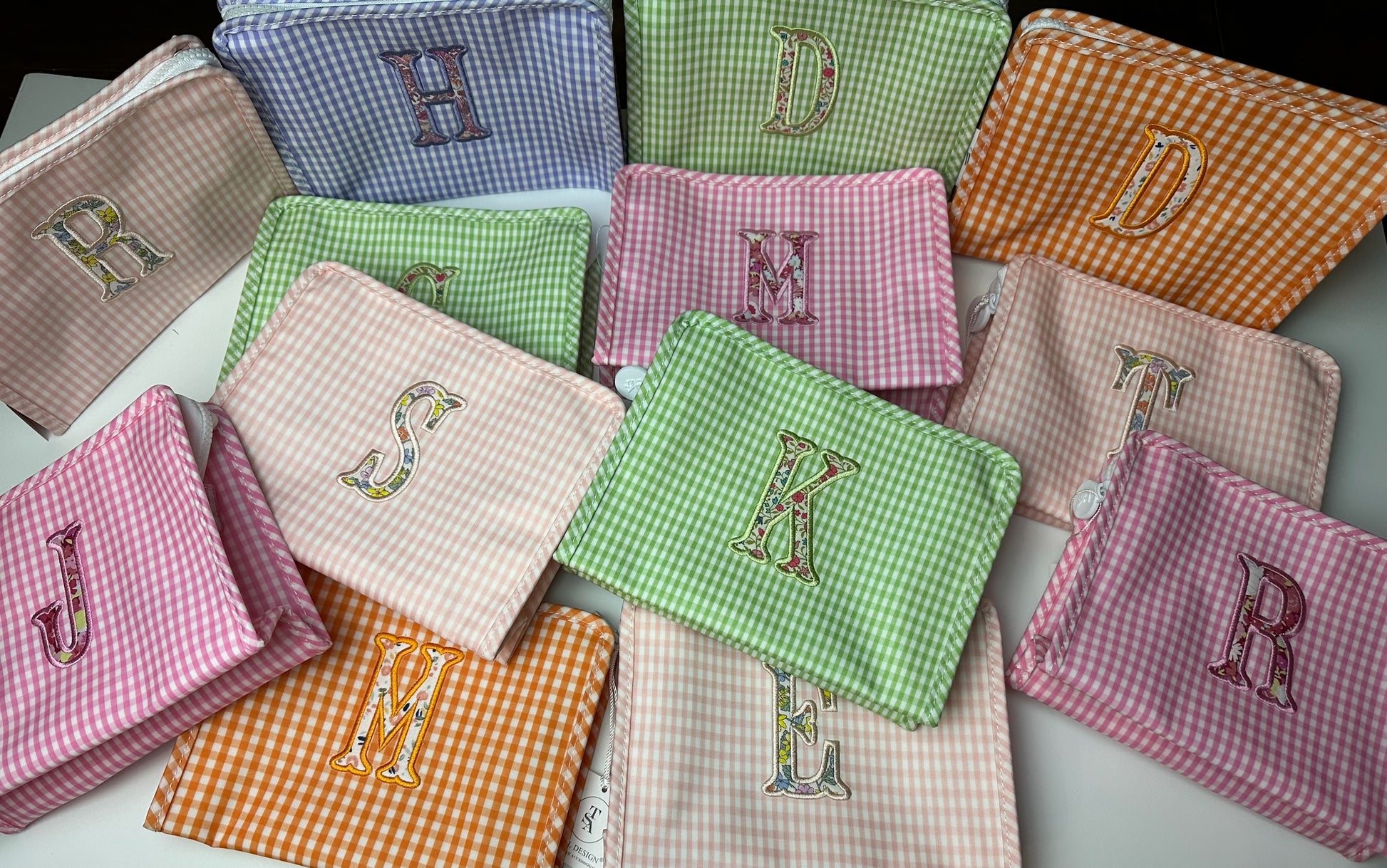 The best-selling Roadies are our BFFs in the pouch world! Roadies are made in a cotton gingham with a thin Eco-friendly matte coating, an inside slip pocket and exterior snap open zip tabs for a wider opening and an easier access. These are perfect for embroidery!