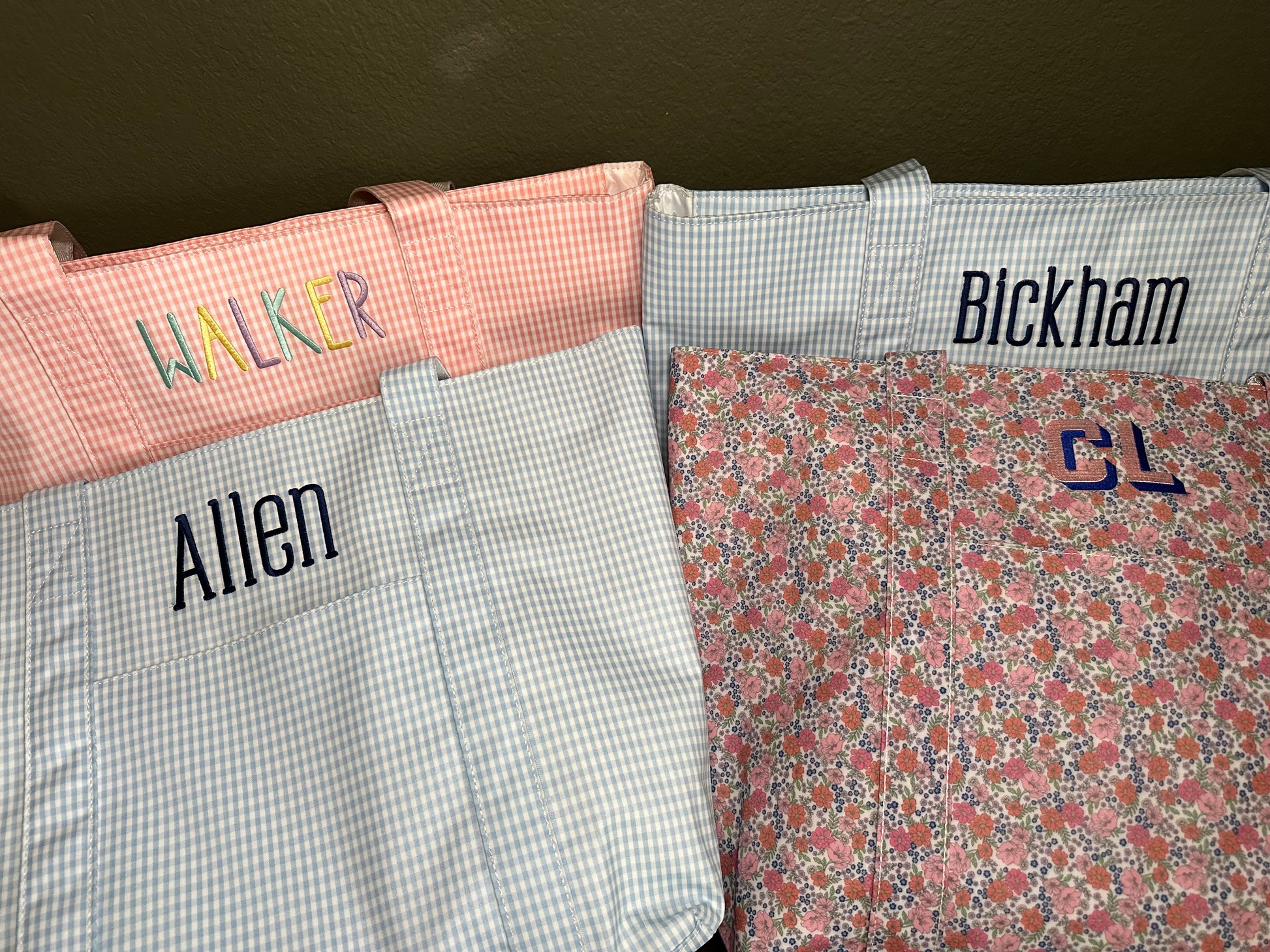 This do-it-all lightweight tote is perfect for travel days, a beach bag, or everyday. Underneath the strap is satin webbing to prevent slipping. It has a front pocket and two inside pockets. The top zips to keep everything inside and the back has a suitcase handle passthrough! Perfect for a monogram, initial, or name.